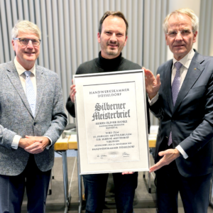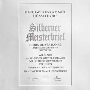 Ein bedeutender Meilenstein wurde am 12.11.2025 gesetzt: An diesem Tag erhielt ich den silbernen Meisterbrief, eine Auszeichnung, die mein langjähriges Engagement und die kontinuierliche Weiterentwicklung im Zahntechniker-Handwerk würdigt.